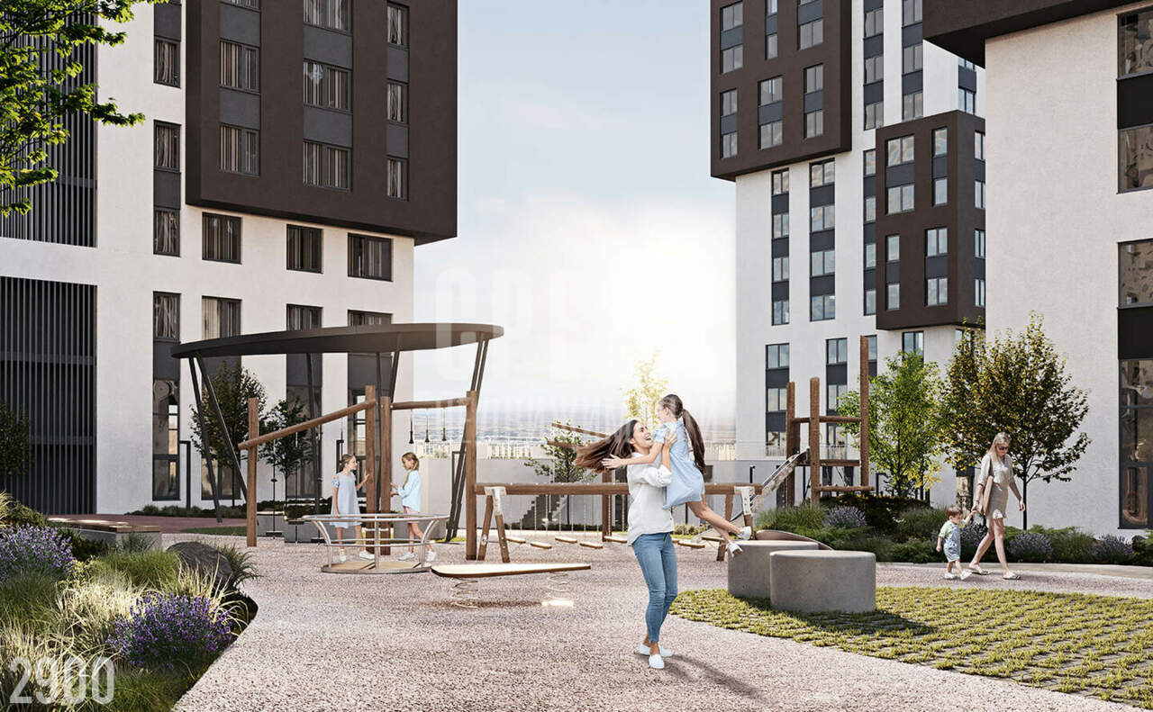 Двор без машин, насыщенное озеленение: вечнозелёные кустарники, луговые газоны.